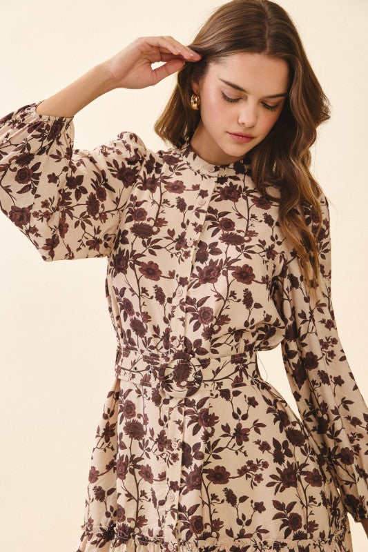 Embrace effortless charm in the Mya Floral Dress, where delicate florals meet sophisticated design. The high neckline and long puff sleeves with gathered cuffs offer a graceful silhouette, while the front button closure adds classic appeal. Shape your look with the removable buckle belt that highlights your waist, and enjoy the playful elegance of the tiered ruffle hem. Perfect for any occasion, this dress combines femininity with versatile style to elevate your wardrobe effortlessly.