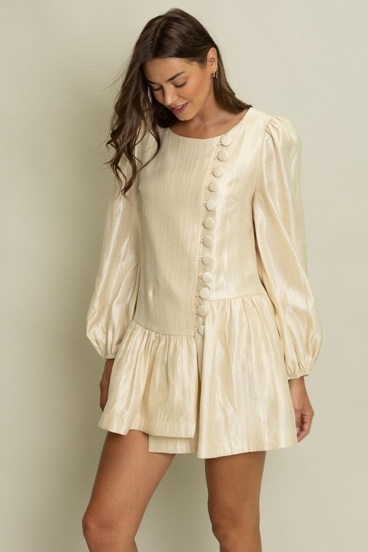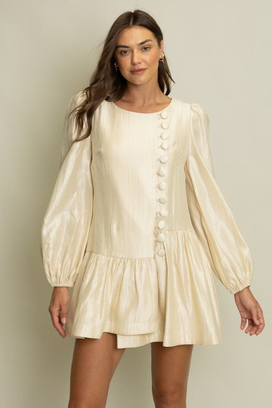 Radiate elegance in this luminous mini dress, designed with voluminous long sleeves, a softly gathered skirt, and a line of covered buttons that add a sophisticated, vintage inspired touch. The subtle shimmer finish elevates the entire look, making it perfect for holiday events, bridal showers, or any special occasion. A standout piece that brings effortless glam to any boutique collection.