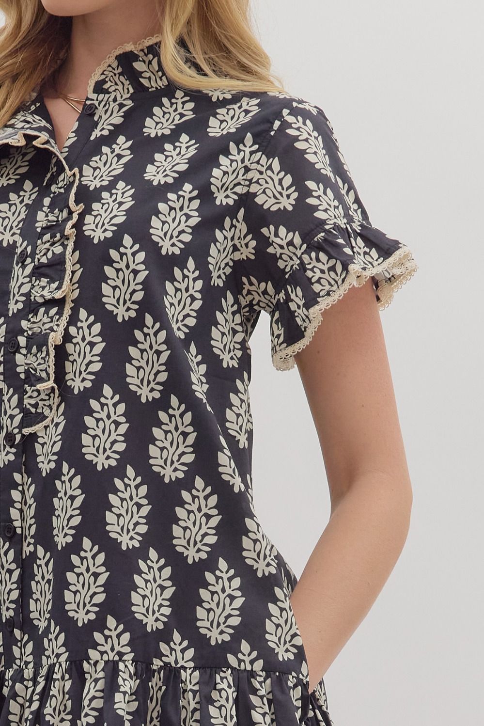 Botanical print short flutter sleeve mini dress featuring ruffled trim button-front placket and stand collar. Crochet edge detailing. Tiered skirt. Side pockets. Lined. Woven. Non-sheer. Lightweight.