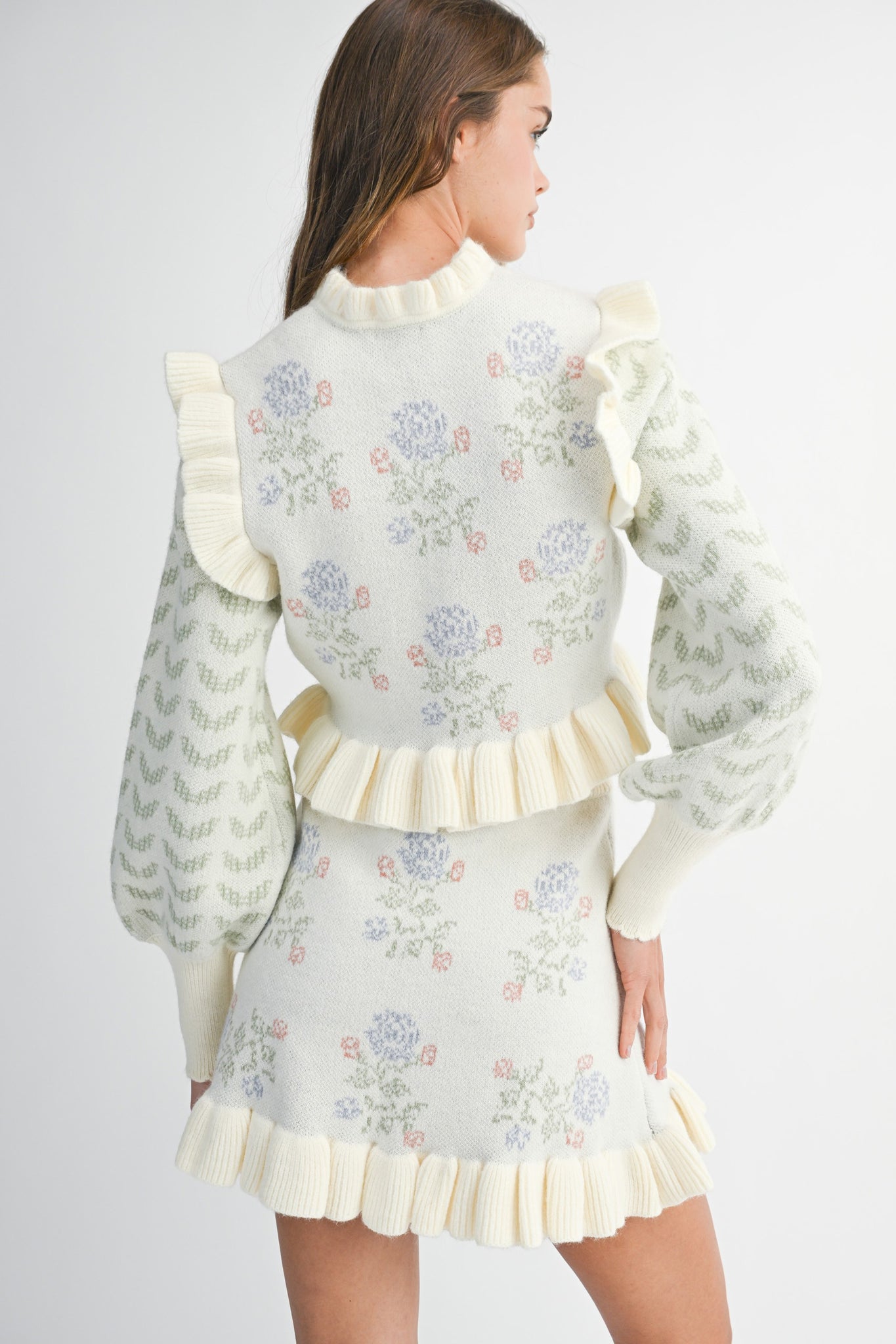 Elevate your style with the Maggie Set, featuring a vibrant multi-color floral print knit fabric. The long sleeve crop top showcases delicate ruffle details and a flattering peplum silhouette, while the matching mini skirt complements with a playful ruffle hem. Perfect for turning heads at any gathering, this coordinated set combines comfort and chic effortlessly.