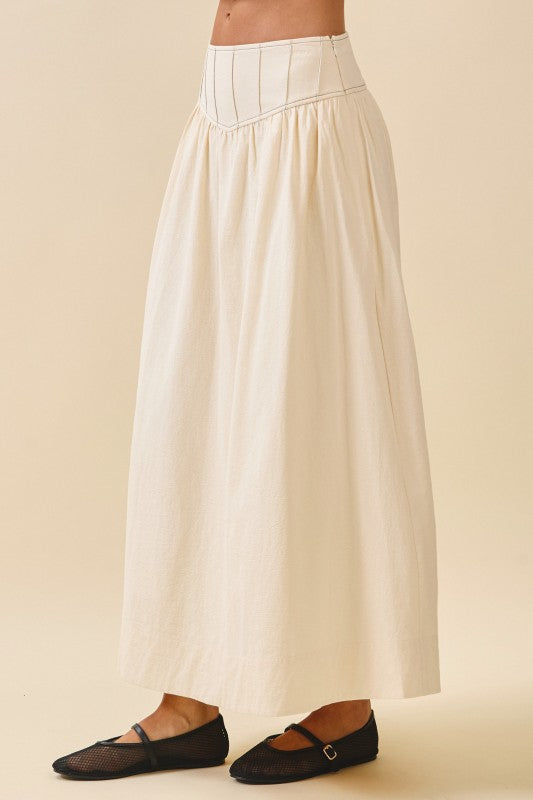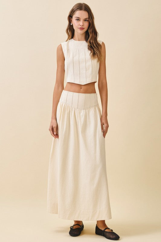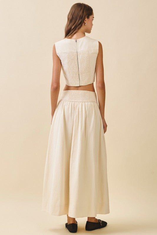 Elevate your wardrobe with the Nixon Set in Ivory, combining elegance and comfort effortlessly. The textured sleeveless top features contrast vertical stitching, a flattering round neckline, and a curved hem with a smocked back panel and exposed back zipper for a stylish fit. Paired with a breezy A-line maxi skirt, it offers a stitched V-yoke waistband, gathered volume, and a smocked back for ease. Convenient side pockets complete this versatile set, perfect for any occasion where comfort meets chic.