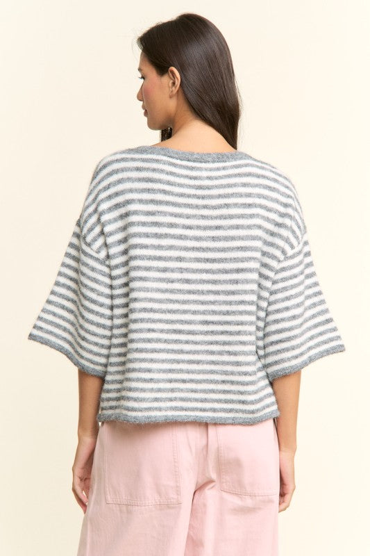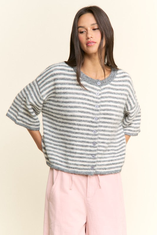 Effortlessly chic and undeniably versatile, this striped button-down sweater brings casual sophistication to your everyday wardrobe. The relaxed, boxy silhouette pairs perfectly with everything from jeans to tailored trousers, while the cropped length flatters any frame. Crafted from a premium blend of polyester, nylon, acrylic, wool, and spandex, it offers the perfect balance of comfort and durability. Short sleeves and a classic round neckline make layering a breeze, and the button-front closure gives you easy styling options. The timeless brown and white stripe pattern is a wardrobe staple that never goes out of style.