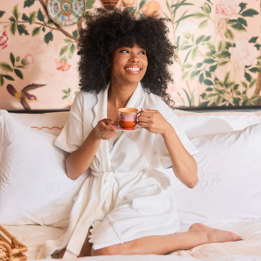 Say hello to the Short Plush Robe, Weezie’s take on velour. · Made mini with a short hem and sleeves to match. · Velour-like exterior lined with traditional, absorbent terry. · Loopless fabrication (read: velvety soft and snag-free!). · Customizable with embroidery or applique.
